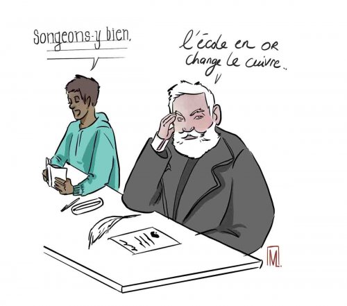 Tout va bien. Ma classe ressemble à un repère pour jeunes hyperactifs inadaptés. On y apprend tant qu'on peut, au rythme qu'on veut. Les séances sont ponctuées de débats plus ou moins reliés au cours lancés inopinément par les élèves : « C'est qui le meilleur ami de l'homme ? Le chien ou le cheval ? » et de concours improvisés de lecture « à la française » de poèmes de Victor Hugo : « Demain dès l'auuuubeuuh, à l'heure où blanchit la campagnneuh ». Seul hic de la semaine : j'ai deux conseils de classe. L'occasion d'observer le gouffre qui me sépare des autres profs…