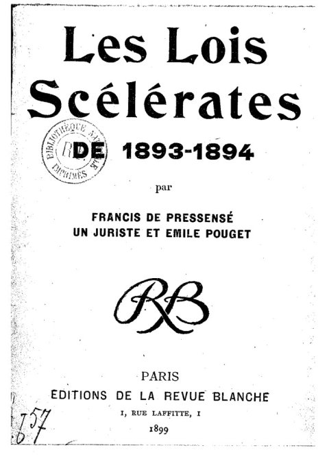 Bonne idée, ce livre republie in extenso trois textes d’époque qui descendent en flèche les trois lois anti anarchistes votées en 1893 et 1894. Ces trois articles, parus cinq ans plus tard dans La revue Blanche, ont été signés d’une part par le fondateur de la Ligue des droits de l’homme Francis de Pressensé, par « un juriste » qui signa anonymement à l’époque, Léon Blum, et enfin par Émile Pouget - le journaliste, natif de l’Aveyron, fondateur du journal satirique Le Père Peinard, auteur du fameux Le sabotage, bref un personnage central dans l’histoire du mouvement libertaire et de l’anarcho-syndicalisme – il fut même l’un des fondateurs de la CGT… (elle aussi a mal tournée...).
