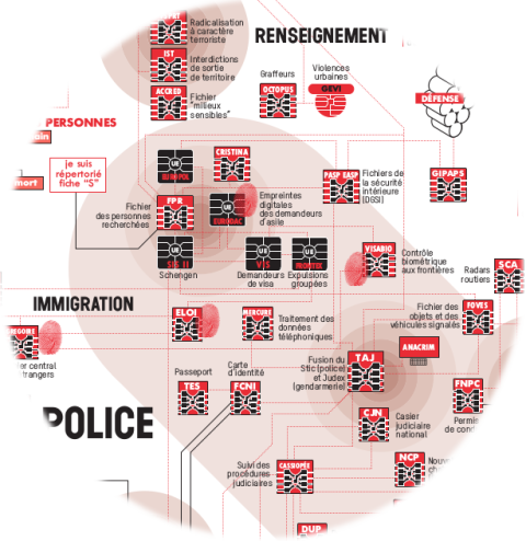 Images : extrait de la cartographie des fichiers paru dans la revue Z, n°11, 2018 — un drone de la police nationale (actu17.fr)